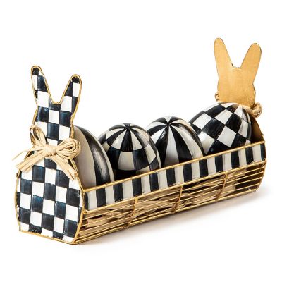 Spring ahead with the Courtly Check® Egg Tray, which holds four hand-painted eggs (two Courtly Check and two Courtly Stripe) in a wire mesh tray finished with tin bunnies on either end.