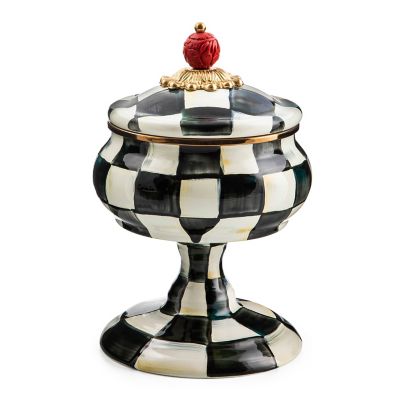 For housing treasured trinkets, there’s no container more charming than our Courtly Check® Enamel Curiosity Pot. A handsome curved pot with a perfectly matched pedestal is dressed in our signature checks and topped off with a lid featuring a brass bobeche and carved crimson bead finial.