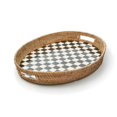 Materials | Heavy-gauge, hand-glazed steel tray base with hand-painted Courtly Checks, rimmed in woven rattan. Pieces may vary due to the handmade nature of each product. Imported. |