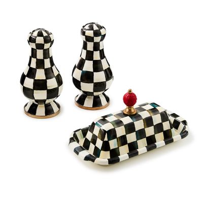A fantastic service set for every hostess. Inspired by our Aurora home’s history in dairy farming, the Courtly Check® Enamel Butter Box brings a dash of style to a utilitarian dish and cover. Crowned with a handsome carved knob and sized just right, any stick of butter should be so lucky to call this hand-painted delight home. And, bigger isn’t always better, but our Courtly Check® Enamel Large Salt & Pepper Shakers sure are fun! Make sure your seasoning supply is up to snuff, because demand will surely be high when calls to “pass the salt and pepper, please” result in the delivery of such flavorful pieces. With a subtle jewel-tone palette woven by an artisan’s brush through the glossy, hand-painted, high-contrast checks, we’ve yet to find a color (or food!) that doesn’t look good with Courtly Check.