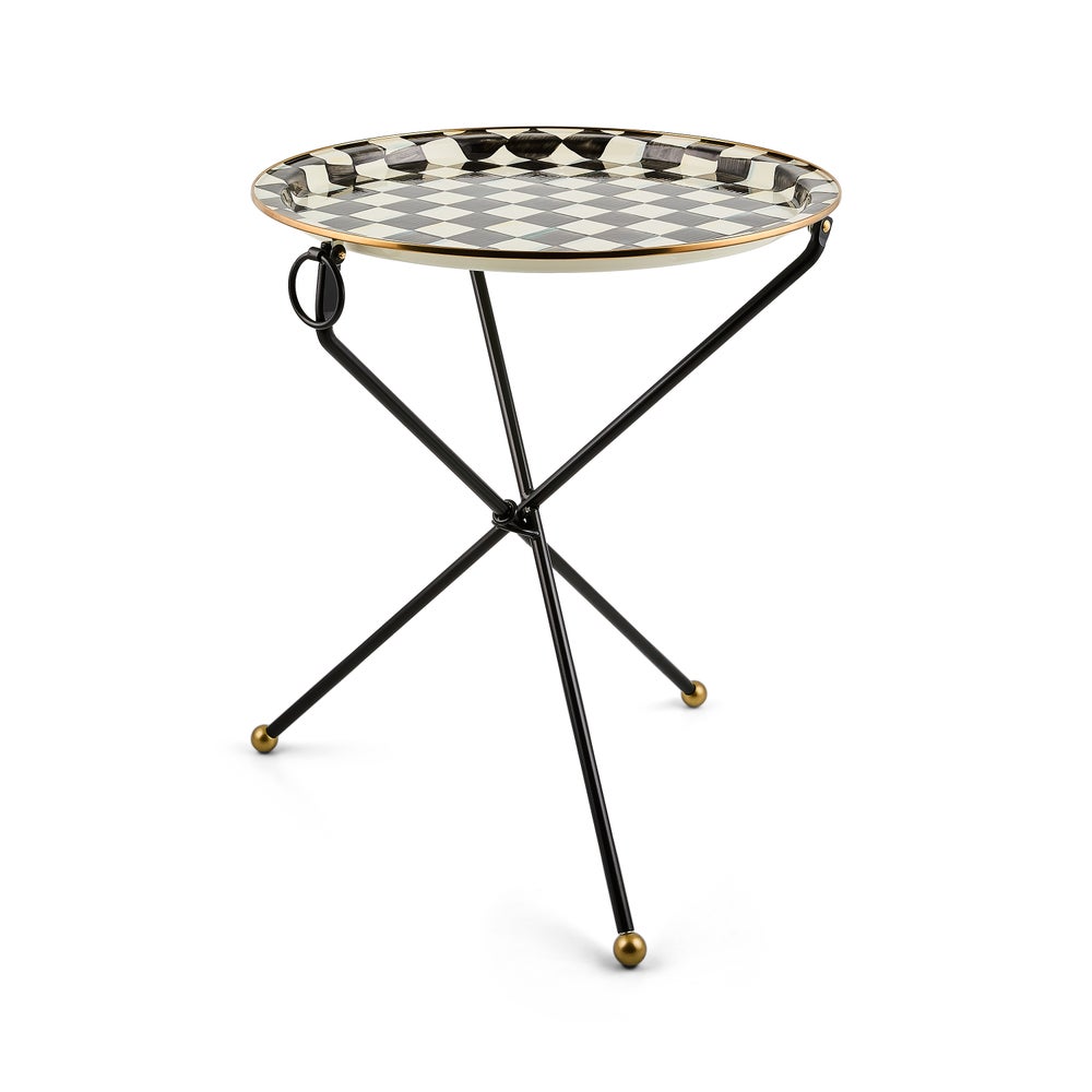 Our Courtly Check Enamel Tilt Accent Table goes from sofa-side to sunroom with ease. Features a tray top in our classic enamelware with hand-applied checks. Folds up for easy transport for wherever it is needed.