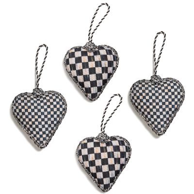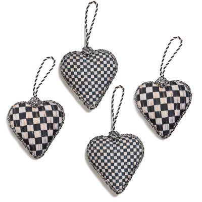Make the tree merry and bright with this set of four heart ornaments, mixing Courtly Check® with black and ivory twisted cording.