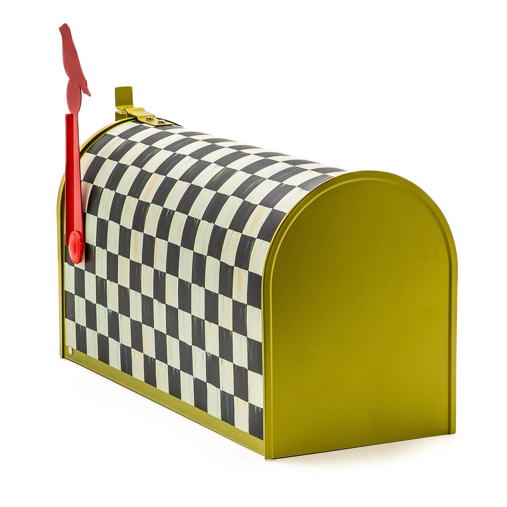 Our Courtly Check® Mailbox is a special delivery. Made of metal, decorated with Courtly Check, and trimmed with chartreuse, it features a red metal bird-on-ball flag for outgoing mail. It complies with all United States Postal Service mailbox regulations.