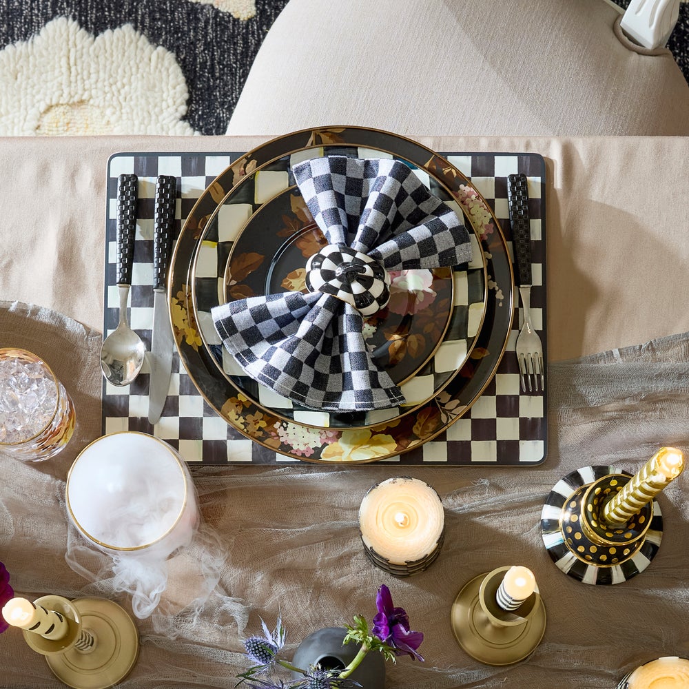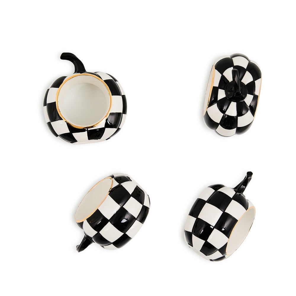 Celebrate the season’s bounty with these Courtly Check Pumpkin Napkin Rings. Decorated in bold black and white, this ceramic set of four makes a great host gift.