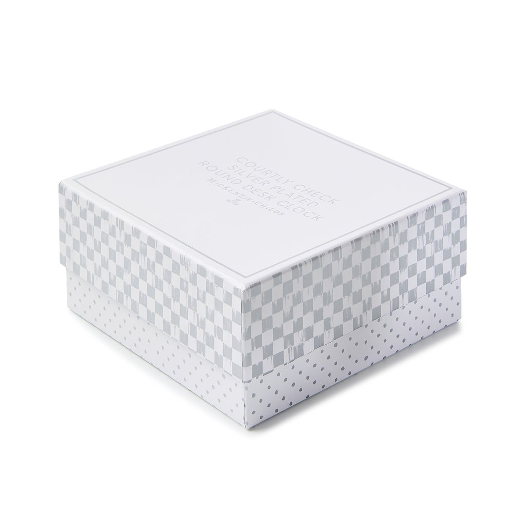 Small in size but big on style, our battery-operated Courtly Check® Silver Plated Round Desk Clock features an enameled coating of Courtly Check on silver plate. Presented in a box for easy gift-giving.