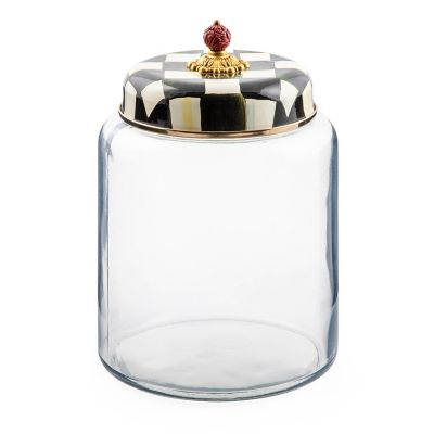 Keep storage spaces, including the pantry, laundry room or craft room, neat and tidy in MacKenzie-Childs style with the Bigger Courtly Check® Storage Canister. The clear glass jar puts contents conveniently on display, topped with our color-dragged black and white pattern and a pretty faux cinnabar knob on the lid.
