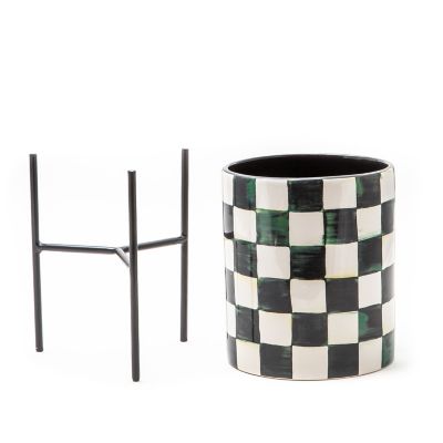 Display your plants or even a bottle of wine with MacKenzie-Childs style in our Courtly Check® Tabletop Planter. This ceramic planter, decorated with our signature pattern, fits into the accompanying three-legged metal stand.