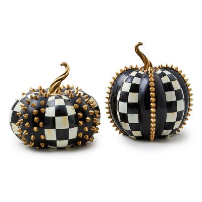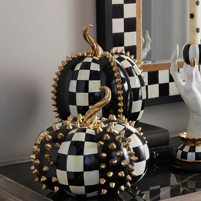 Add some drama to your happily haunted home with the Courtly Check® Tall Gold Spikes Pumpkin, featuring our signature pattern and accented with gold spikes and a twisted gold leaf stem.