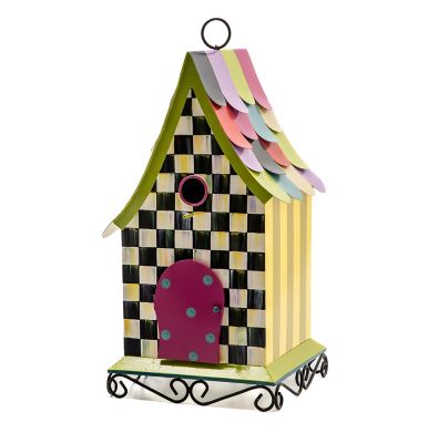 Give your favorite birds of a feather a stylish home tweet home. This one, made of metal and decorated with hand-painted Courtly Check®, is topped with a multi-hued scalloped roof. It’s trimmed with scrolled metal.