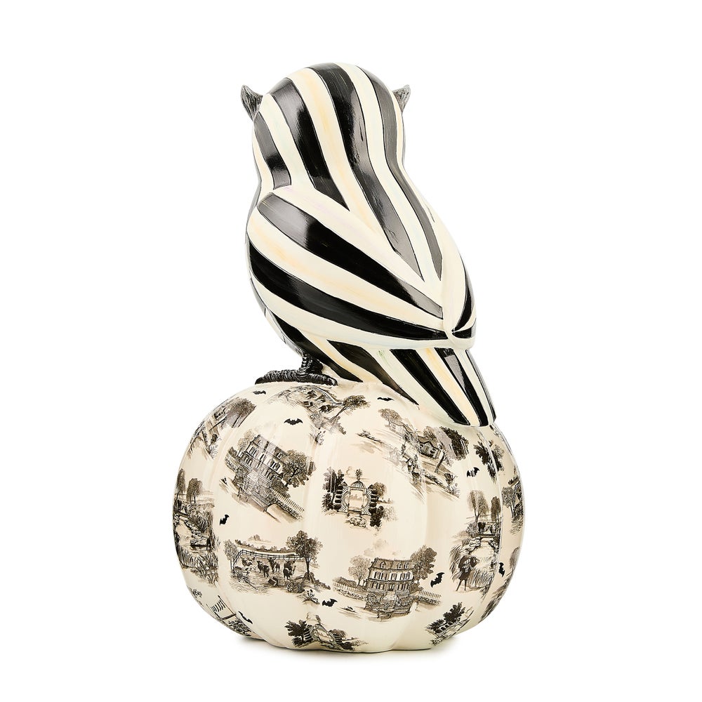 Bring the playful spirit of spooky season to life with the Courtly Owl on Toile Pumpkin. This whimsical pumpkin features a charming Courtly Check-bedecked owl perched on top of a pumpkin adorned with a timeless toile pattern. Perfect for adding a delightfully spooky vibe to your Halloween decor.