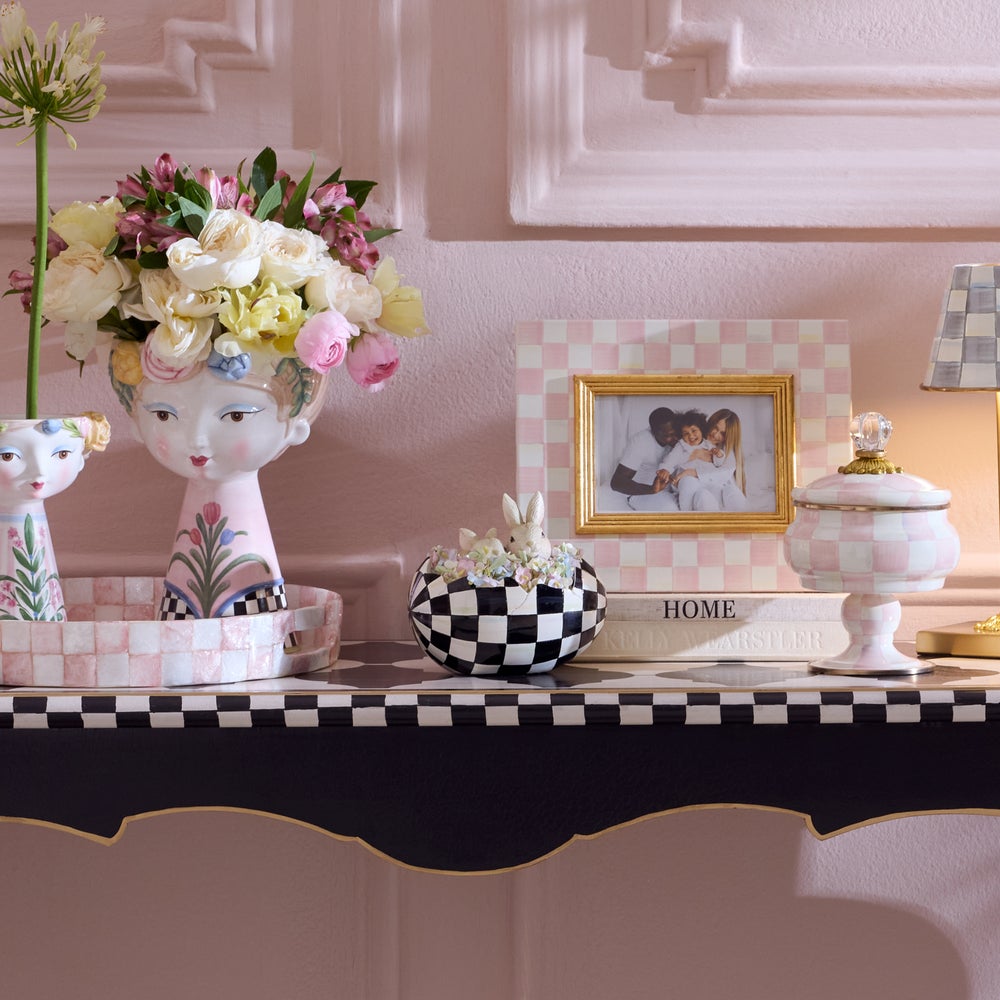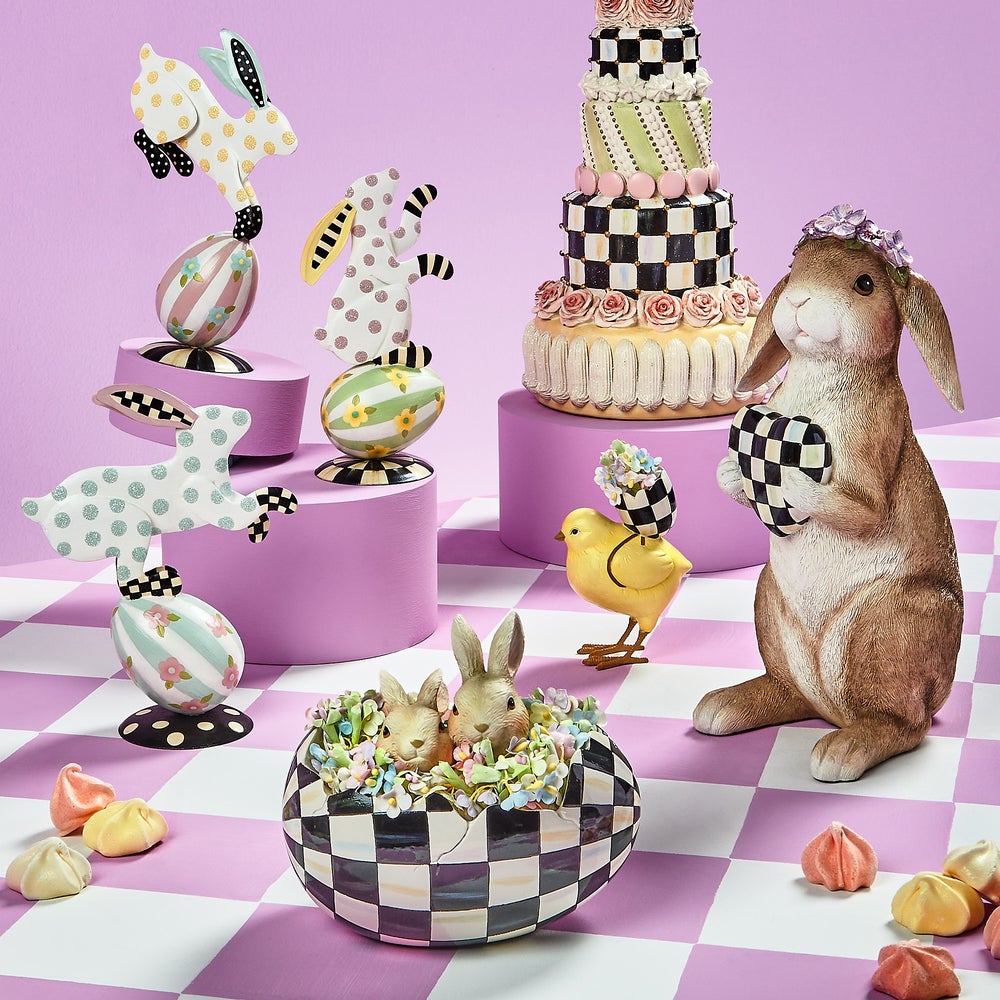 Our hand-painted Courtly Peekaboo Egg simply says springtime. Two bunnies peek out of a cracked Courtly Check® egg, accented with paper flowers.
