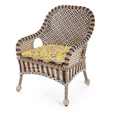 Take wicker up a notch with our Queen Bee Hut Courtyard Outdoor Accent Chair. It’s fashioned in a timeless geometric pattern of hand-woven black, white, and goldenrod resin wicker. It’s set with a Sunbrella cushion that reverses from bumblebee print to black and white stripes, trimmed with twisted black and white cording.