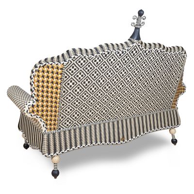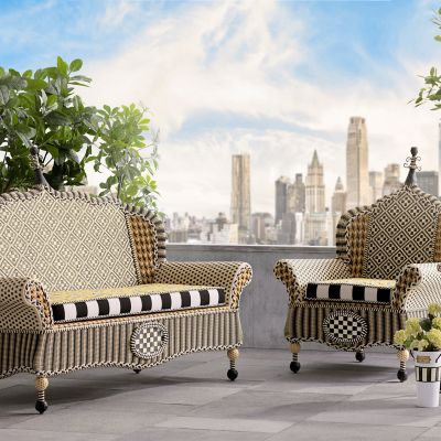 Take wicker up a notch with our Queen Bee Courtyard Outdoor Loveseat. It’s fashioned in a timeless geometric pattern of hand-woven black, white, and goldenrod resin wicker, and set with a Sunbrella bumblebee print cushion that’s trimmed with twisted black and white cording.
