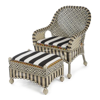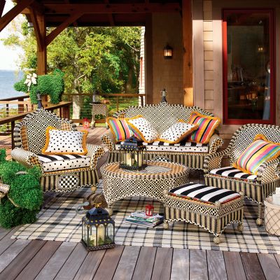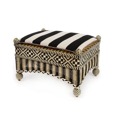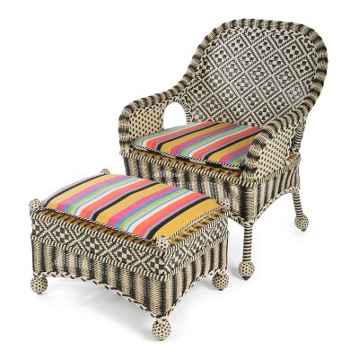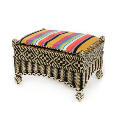 Take wicker up a notch with our Bathing Hut Courtyard Outdoor Ottoman. It’s fashioned in a timeless geometric pattern of hand-woven black, white, and goldenrod resin wicker, and set with a vibrantly multicolored striped Sunbrella® cushion that reverses to a bold black and white stripe.