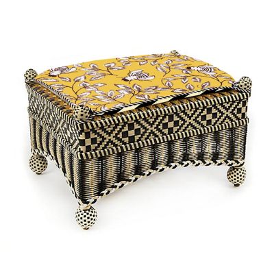 Take wicker up a notch with our Queen Bee Courtyard Outdoor Ottoman. It’s fashioned in a timeless geometric pattern of hand-woven black, white, and goldenrod resin wicker. It’s set with a Sunbrella cushion that reverses from bumblebee print to black and white stripes, trimmed with twisted black and white cording.