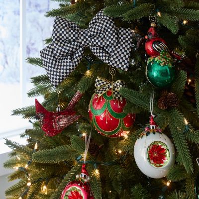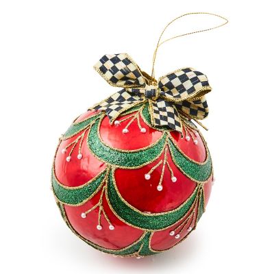 Make the tree merry with this jumbo ball capiz ornament, featuring green scallops on red and accented with faux pearls. It’s topped with a Courtly Check® bow.