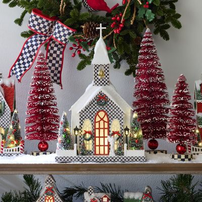 Deck the tabletops, the mantel, and more with this illuminated paper church that’s decorated with Courtly Check® and accented with bottle brush trees, faux snow on the rooftop, and a single white angel. It’s set on a Courtly Check base.