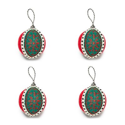 Make the tree merry and bright with this set of four red and green boiled wool ornaments, featuring embroidered snowflakes and finished with woven trim. They hang from a twisted black and white cord.