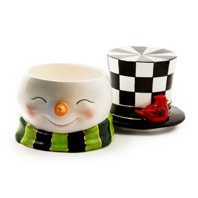 Bake holiday spirits bright with this hand-painted snowman cookie jar. Made of ceramic, the snowman’s top hat lifts to hold cookies and other treats inside. It makes a great gift, too, especially when filled with tasty treats.