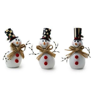 This set of three hand-painted tin snowmen is snow much fun. Each wears a different Courtly hat, trimmed with holly, and has a raffia bow tie.