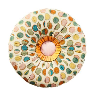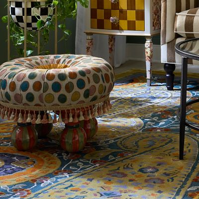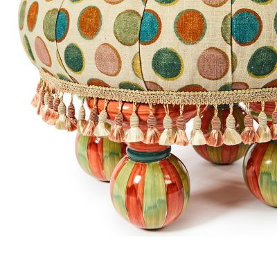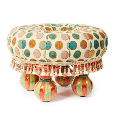 Stylishly accompany any armchair with this footstool, upholstered in dotted linen fabric and topped with a silk button that’s trimmed with pleated silk. Made start to finish in Aurora, New York, it sits on hand-painted ceramic feet and is finished with tassel fringe.