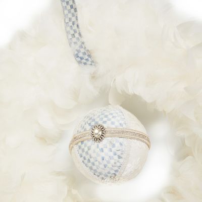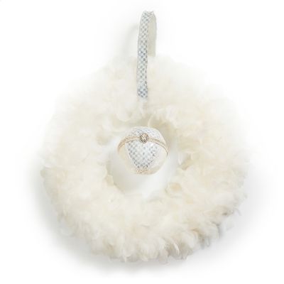 Make your home a winter wonderland and deck the halls with this white feather wreath, decorated with an ornament done in Sterling Check® and brocade and embellished with rhinestone trim and a faux pearl bauble. It hangs from a Sterling Check ribbon.