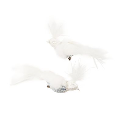 Accent holiday arrangements, wreaths, and more with this set of two white bird clips. They have Sterling Check® on their breasts and are finished with rhinestone collars and white tail feathers.