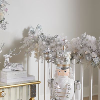 Make your home a winter wonderland and deck the halls with this illuminated garland, featuring everlasting white holiday greenery, faux magnolia blossoms with pearl centers, and shatterproof ornaments. It’s finished with Sterling Check® ribbon.