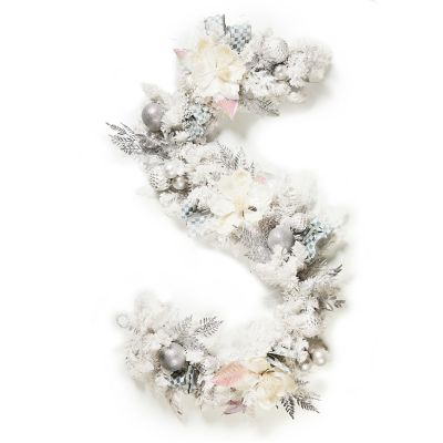 Make your home a winter wonderland and deck the halls with this illuminated garland, featuring everlasting white holiday greenery, faux magnolia blossoms with pearl centers, and shatterproof ornaments. It’s finished with Sterling Check® ribbon.