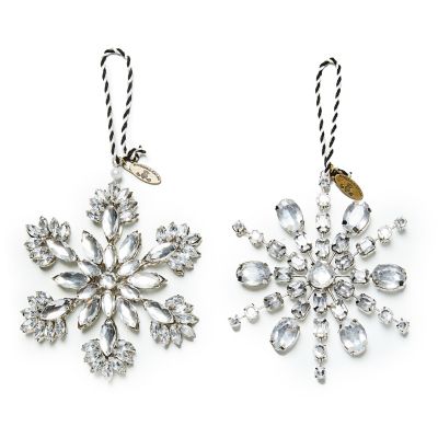 Make the tree a winter wonderland with this set of two metal and rhinestone ornaments that are done in snowflake shapes. They hang from twisted black and white cord loops and are finished with MacKenzie-Childs charms.