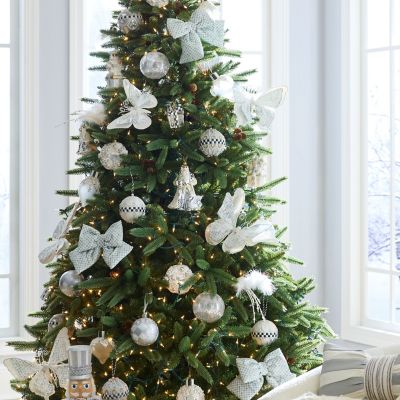 Make the tree a winter wonderland with this set of four glass ball ornaments. Each has a distinct glittered design, and they’re topped with silver swan finials.