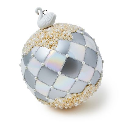 Make the tree a winter wonderland with this jumbo-sized glass ball ornament, featuring a glittered harlequin pattern, accented with faux pearls, and topped with a white swan finial.