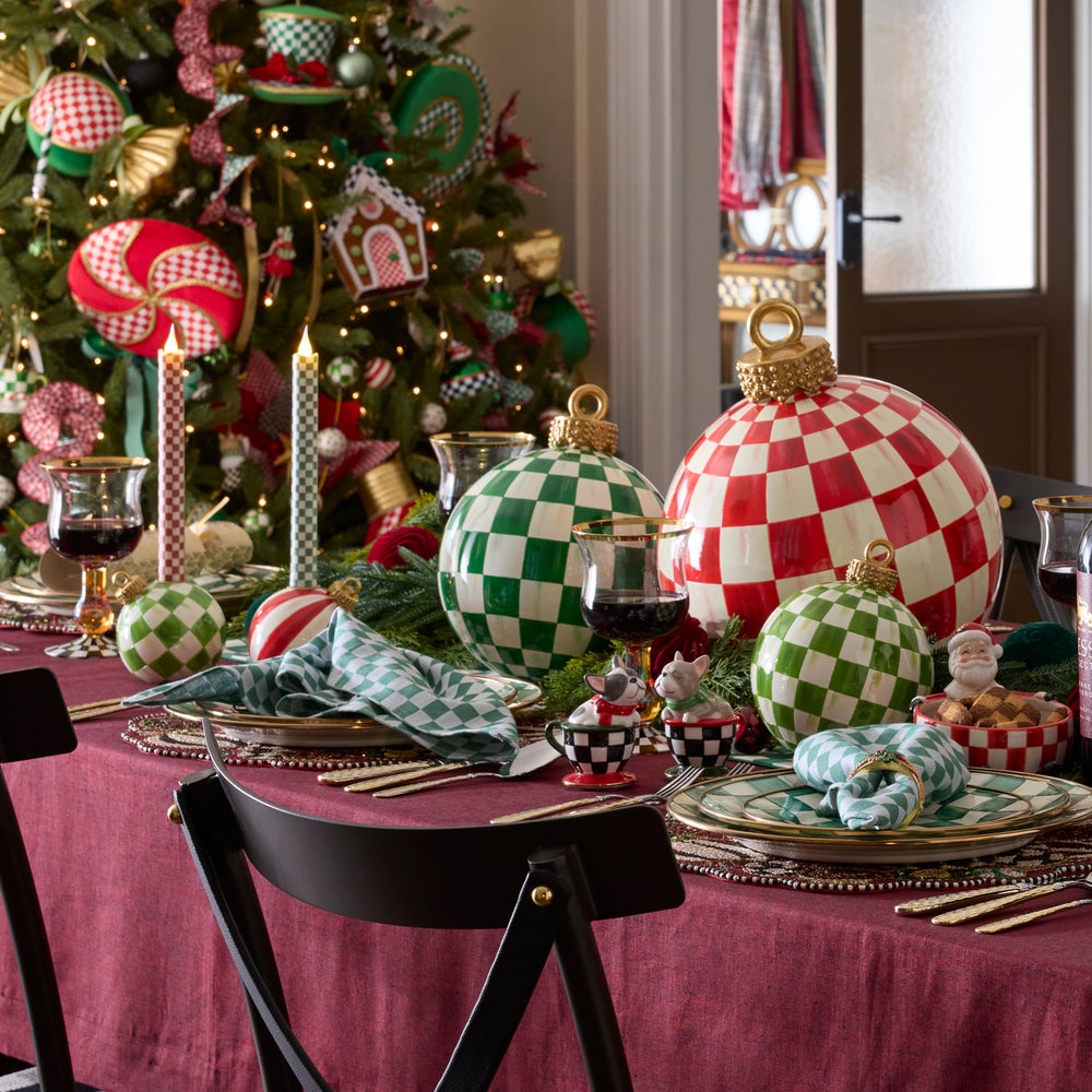 Deck the tabletops with this oversized ornament, featuring watercolor-style dark green checks, topped with a gold foil cap.