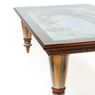 Seated at our Diorama Dining Table for 6, guests are treated to a three-dimensional bird’s eye view of Cayuga Lake and the farmlands that surround our studio. The “diorama,” hand-painted by our artisans on three wood layers, is protected by a clear glass top and framed in hand-finished cherry wood. The table rests on hand-glazed, hand-painted ceramic legs, also made here on the farm. Allow 16 weeks for delivery of this meticulously crafted masterwork.