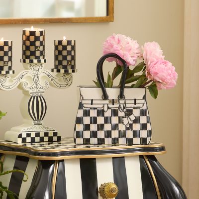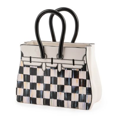 Flowers, fresh or everlasting, will be in full bloom with this whimsical, handbag-shaped ceramic vase decorated with doodles and Courtly Check®.