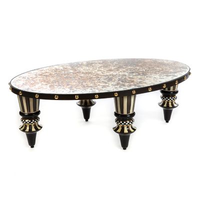Our Dotography collection of furniture takes the classic simplicity of black and white way beyond basic with glamorous details that provide texture and interest. The Dotography Coffee Table, with an iron frame with brass components, reflects your good taste with a mirrored top featuring the finish of antiqued mercury glass. Ceramic legs, hand-painted by our artisans in Aurora, New York, add to the one-of-a-kind look.