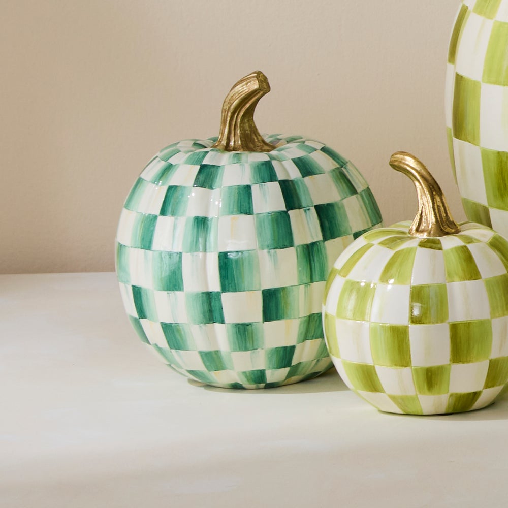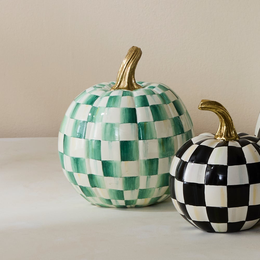 Take your pick from our truly unique pumpkin patch with the Emerald Check Small Pumpkin. Decorated in our botanical check pattern and topped by a glimmering gold stem, this decorative gourd is sure to be a favorite in any autumnal display.