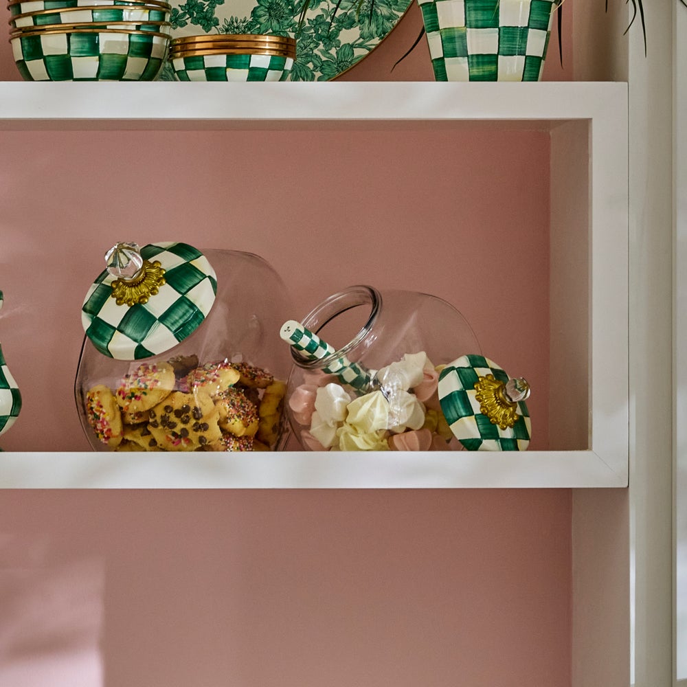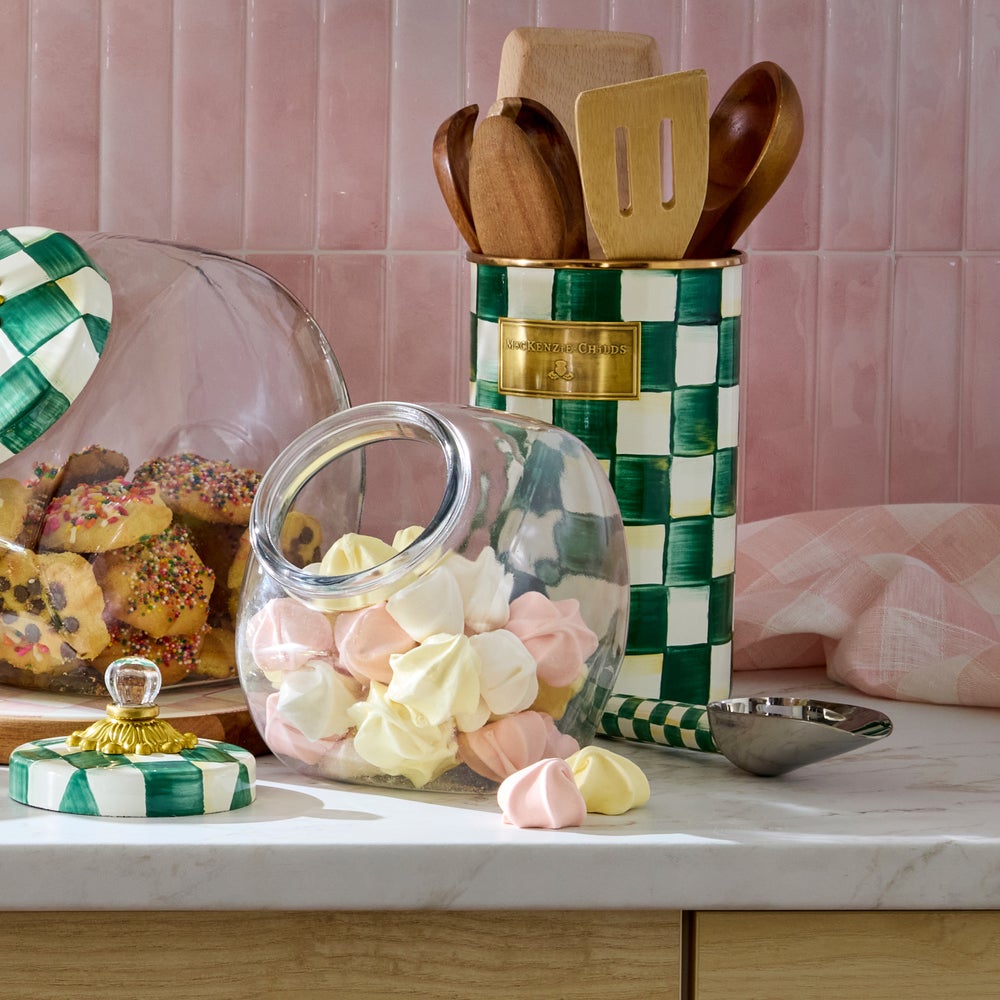 Here’s the scoop on our Emerald Check Small Scoop. It’s just the right size for our glass cookie jars with enamel lids, making it so convenient to get to baking staples, dog biscuits, or whatever you put in these versatile storage containers. The enameled handle features hand-painted Emerald Check, topped with a stainless-steel scoop.