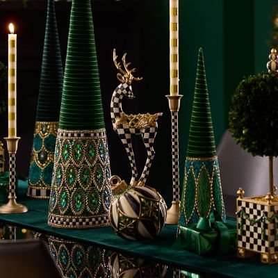Deck the tabletops or the mantel with this Courtly Check® deer on ornament figurine that has gold leaf antlers and hooves. It’s standing on a striped ornament that’s trimmed with emerald green accents.