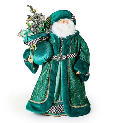 This Santa is a handmade delight, brimming with details from head to toe. Wearing an emerald green brocade coat, accented with plush trim and Courtly Check®, and a Courtly Check stocking cap, he holds a sack overflowing with gifts and a potted tree. Place this special figure in a spot where it will get all the attention it deserves.