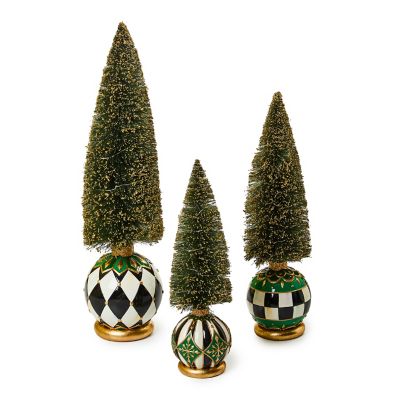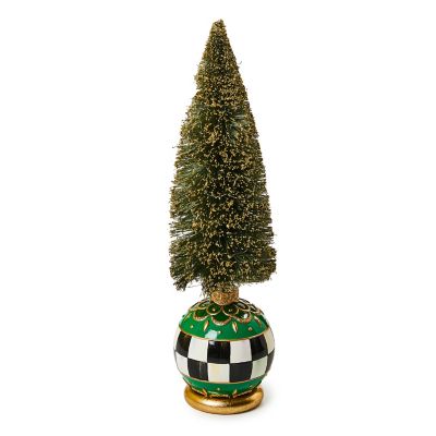 Deck the table, the mantel, and more with this medium illuminated green bottle brush tree that’s dusted with gold glitter and set in an ornament base decorated in Courtly patterns with emerald green accents.