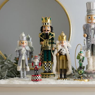 Get cracking and add this wooden hand-painted nutcracker that shimmers head to toe in emerald green and Courtly Check® to your holiday collection. Delightful details include a harlequin-patterned velvet coat and a gold leaf crown trimmed with faceted emerald green accents. It holds a small metal French horn.