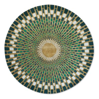 Our 6′ Round Emerald Sunburst Rug mixes greens and golds in a classic mosaic pattern. This wool-blend tufted and hooked rug is the perfect complement to our Emerald collection of furniture.