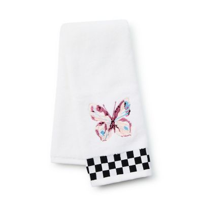 Give your bath an instant makeover with this hand towel. Made of 100% cotton terrycloth, it features a pink butterfly and is trimmed with a black and white check border.