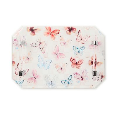 Display with delight on this pretty and practical jewelry tray that features a print of butterflies and pink checks under glass. It’s trimmed with sleek acrylic handles.