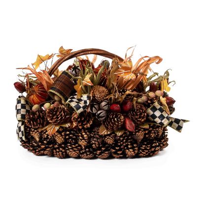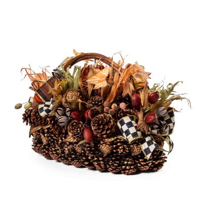 Deck the tabletops with this twig basket decorated with pinecones, filled with everlasting greens, and accented with Courtly Check® ribbon.