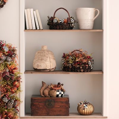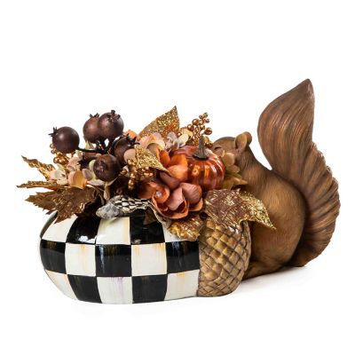 Welcome fall with this fun arrangement, featuring a hand-painted squirrel with an oversized Courtly Check® acorn dish, filled with autumnal elements, including pumpkins and leaves.