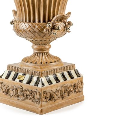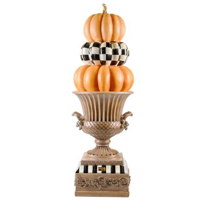 Capture the elegance of autumn with this stacked pumpkin urn. Made of resin that resembles carved wood, it features a scrolled base, accented with Courtly Check® acorns and Courtly Stripe on the pedestal. It’s topped with a stack of three hand-painted pumpkins, including one of Courtly Check.
