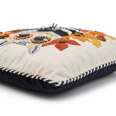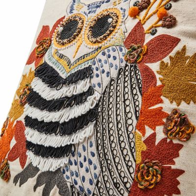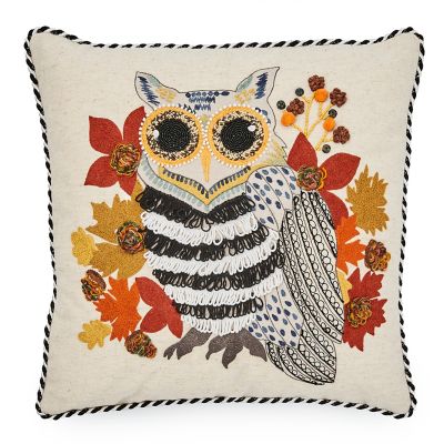 Accent your harvest home with this lumbar pillow, featuring an owl done in chenille embroidery, accented with yarn loops and beads, and finished with twisted black and white cording.