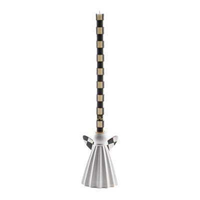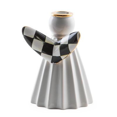 Illuminate the holidays with farmhouse-style ceramic angel candle holder, simply decorated with checked wings and gold lustre. It holds a dinner candle.
